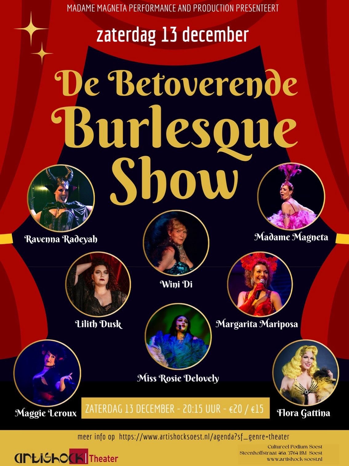 Onze performers staan te popelen om Soest opnieuw te laten stralen met hun meeslepende optredens. Klassiek Burlesqueontmoet moderne flair in een show vol verrassingen, theatrale pracht en fonkelende persoonlijkheden. Een avond waar elegantie en ondeugendheid hand in hand gaan, speciaal voor iedereen die zich even wil onderdompelen in een andere wereld.