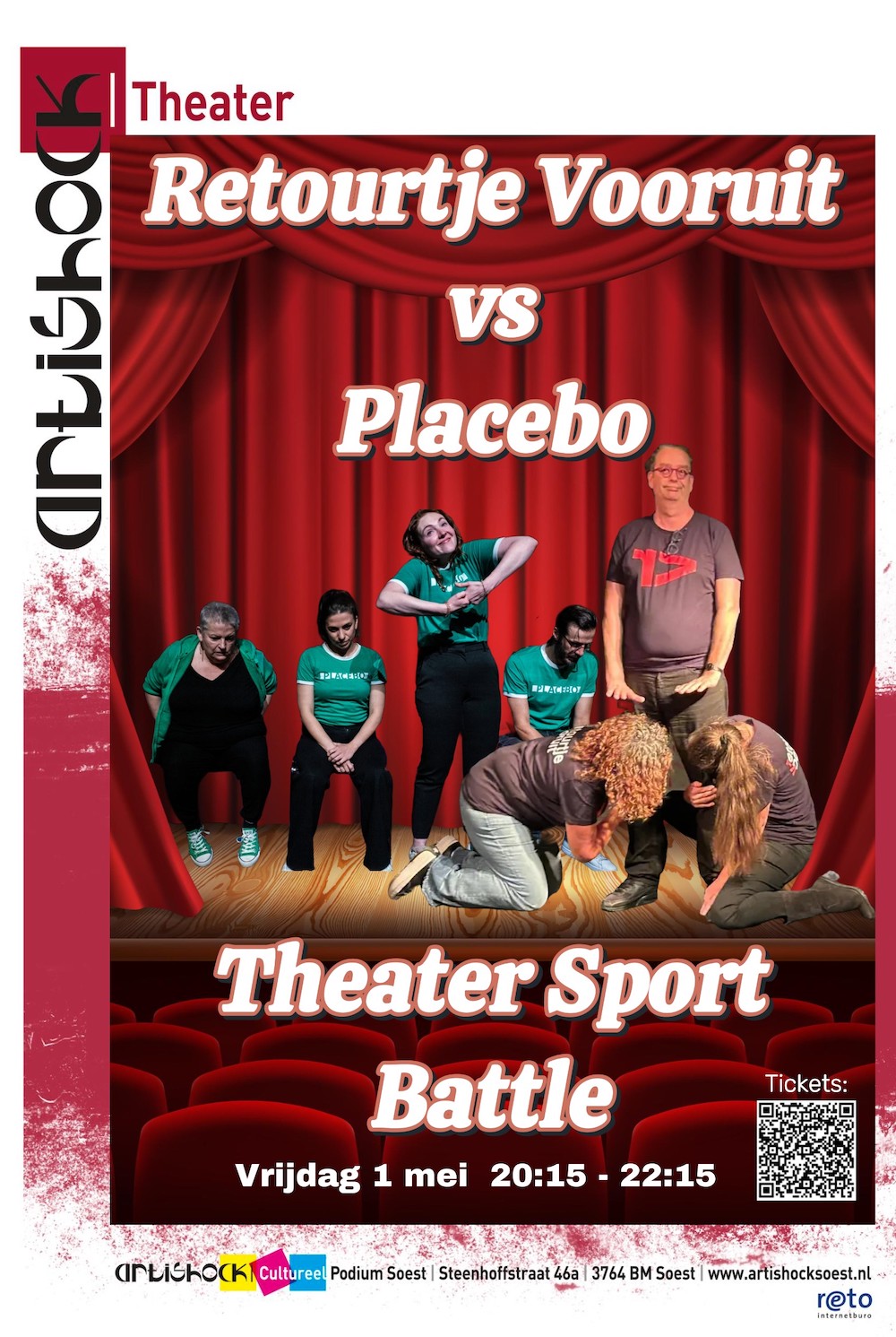 ´Retourtje Vooruit´, de enige theatersportgroep uit Soest, heeft haar inmiddels legendarische battle op deze bijzondere dag, dit keer met het Amsterdamse ‘Placebo’. De naam zegt het al: het komt goed en werkt hoe-dan-ook, als je er maar in gelooft. Yep! De kracht van de suggestie ís de kern van theatersport.. Geniet van de vele games, de interactie met het publiek (geen zorg, je hoeft het toneel zelf niet op), het worden vermaakt en geraakt en ervaar hoe ontwapenend en heerlijk zo’n avondje licht en luchtig kan zijn!