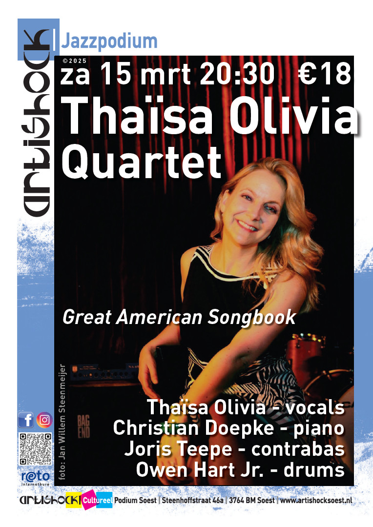Zangeres en bandleider Thaïsa Olivia put graag uit het Great American Songbook. New York, waar ze in 2013 vocaal debuteerde, is haar tweede thuis. Ze trad onder anderen op met pianist Ellis Marsalis (de vader van Branford en Wynton!), de pianisten Peter Beets en Karel Boehlee en bassist Joris Teepe. Haar kwartet-cd ‘Let Go’ kreeg lovende recensies. Ze tourde door Duitsland en de VS. Thaïsa is ook een songwriter. Cole Porter, Nat King Cole, Duke Ellington en Billy Strayhorn, Thaïsa Olivia weet er wel raad mee. Dat geldt evenzeer voor haar begeleiders, die stuk voor stuk hun reputatie (op bas, drums en piano) zowel in Nederland als in het buitenland ruimschoots hebben verdiend.