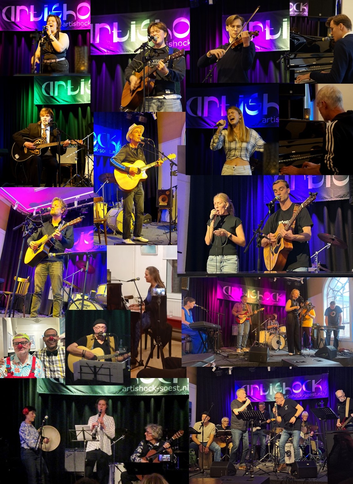 Het optreden van Maarten Arnoldus begon heel verrassend. Hij stond klaar, werd plots gebeld en struinde al hart pratend door zijn mobieltje van het podium en door de zaal weg. Iedereen in verwarring achterlatend. Maar al snel bleek dat dit onderdeel was van zijn optreden. Bellend, struikelend en vallend kroop hij weer naar het podium en speelde 2 nummers op gitaar waarbij iedereen aandachtig en muisstil luisterde naar zijn Nederlandstalige eigen nummers, zang en gitaarspel. Luid klappend na zijn optreden. Het was duidelijk dat de bezoekers verrast waren door de mooie performances van deze jonge mensen. Theo Linde vertelde het publiek dat hij moeite had gehad met ‘slechts’ een kwartier optreden, wat tja, als je zo’n groot arsenaal aan nummers kunt spelen, welke drie nummers kies je dan uit voor het Artishock Open Podium optreden? Een dilemma dus. Zijn keuze was gevallen op openen met “Riders on the storm” van The Doors, inclusief gitaar en beugel-mondharmonica spelend, en hij eindigde met de klassieker “Bad, Bad, Leroy Brown” van Jim Croce. Die hoor je niet zo vaak meer. Zijn optreden werd gevolgd door vier Nederlandstalige nummers, twee gespeeld van Frank van der Laan waarbij het ogenschijnlijk leek of hij optrad voor zijn twee meegebrachte jonge kinderen die spontaan vooraan op twee stoelen kropen en aandachtig luisterden naar de songs van hun vader. Daarna kwamen twee nummers van Soester Guus Jongen. Heerlijke verrassende luistermuziek. Intussen al meer dan twee uur verder en nog niet gedaan met Open Podium. Als een soort ‘Freek en Suzan’ trad het Soester duo Luc en Linette op. Prachtig zang van beiden, met begeleiding op gitaar van Luc. Adembenemend is de juiste kreet voor dit optreden. Het trio Sjaalman & Co met Miriam Stern (zang en trom), Joanna de Jonge (klarinet) en Johan de Koning (gitaar) brachten Artishock met drie nummers naar Oost-Europese sferen. Het publiek meenemend in hun enthousiasme. En toen was het de beurt aan de Artishock Popsessieband, 7 man sterk dus die hadden wat tijd nodig om de instrumenten aan te sluiten en klaar te gaan staan. Dat konden ze doen terwijl Marjolein Bonten (speciaal ingevlogen vanuit Baarn) uit volle borst twee nummers zong en zichtzelf begeleidde op de akoestische piano voor de nog steeds enthousiaste bezoekers. De Artishock Popsessieband bestaande uit o.a. enkele vrijwilligers van de Blues-Pop werkgroep, oefent al geruime tijd 2-wekelijks op dinsdagavond in de filmzaal en ze hebben veel lol met muziek maken. De primeur voor een openbaar optreden was tijdens de Podiade 2025 op 13 september, maar deze Open Podium middag mochten ze niet overslaan. De Artishock Popsessieband viel de eer ten deel om deze mooie middag vol met verrassende (semi)akoestische optredens af te sluiten met een serie bekende covers uit de jaren ‘60 en ‘70 van The Beatles, CCR, The Rolling Stones, The Animals en Van Morrison. Spontaan werd er meegezongen en werden er stoelen aan de kant geschoven zodat er zelfs nog even gedanst kon worden. Een mooie afsluiter van deze geslaagde middag. De belangeloos optredende artiesten, de vele meewerkende vrijwilligers, de geluidsmannen en natuurlijk het enthousiaste publiek hebben van deze gratis toegankelijke Open Podium middag een groot succes gemaakt. Dank aan allen die deze middag mogelijk gemaakt hebben.