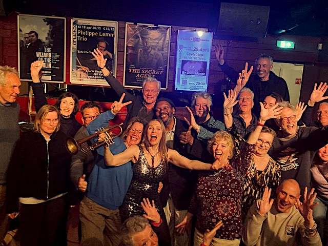 Een mooie tune voor het jubileumjaar van Artishock in 2027? Het repertoire varieerde van bebop tot jazzdance en gospel waarbij opnieuw werd meegezongen onder leiding van Warren. Ook ‘Kom van dat dak af’ kwam nog even langs en dat was natuurlijk omdat de originele drummer van Peter & The Rockets: Frans Meijer achter het drumstel zat.